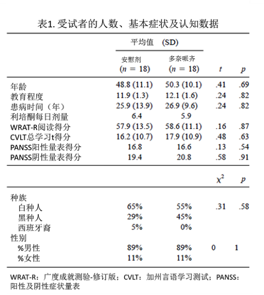 方法:選定36個精神分裂癥患者樣本,進(jìn)行為期12周的多奈哌齊(5毫克和10毫克劑量)與利培酮聯(lián)合治療的雙盲安慰劑對照試驗。