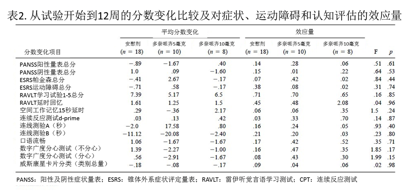 鑒于一些文獻(xiàn)資料有證據(jù)表明類膽堿藥物可能對精神分裂癥癥狀(Edelstein等人,1981)和錐體外系癥狀(Caroff等人,2001)有治療效果,有研究對多奈哌齊在這些癥狀領(lǐng)域的治療效果也進(jìn)行了探索和分析。多奈哌齊5毫克和10毫克治療與安慰劑治療相比,在PANSS陽性癥狀(F=1.74,df=101,p=.18)和陰性癥狀(F=.38,df=100,p=.68)的轉(zhuǎn)換中,并沒有顯著差異。另外,多奈哌齊治療和安慰劑治療在帕金森癥(F=.51,df=101,p=.6)與嚴(yán)重運動障礙(F=.01,df=101,p=.99)轉(zhuǎn)換的ESRS評定中也沒有顯著差異。在其他測試結(jié)果中也未見任何顯著差異(見表2總結(jié))。